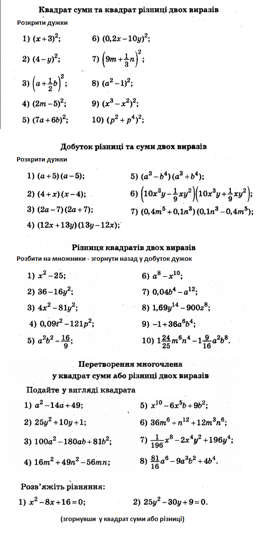 Для опрацювання вправ необхідно повторити матеріал з обчислення числових прикладів та формул скороченного множення.