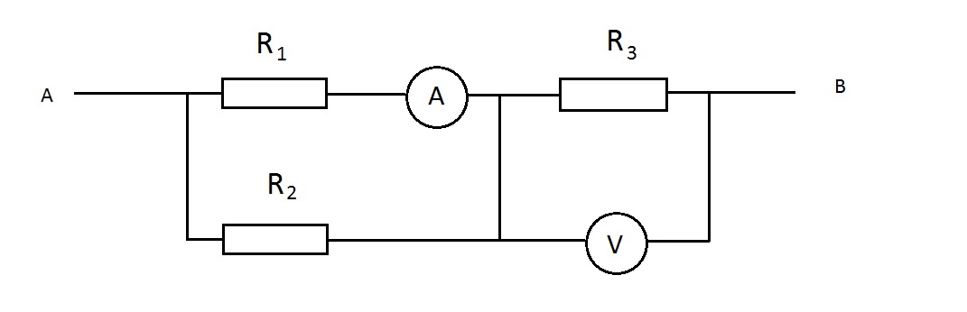 3) Визначте сили струмів та напруги на резисторах, якщо R1 = 30 Ом, R2 = 60 Ом, R3=40 Ом, а покази амперметра та вольтиметра дорівнюють 0,1А та 6В відповідно.